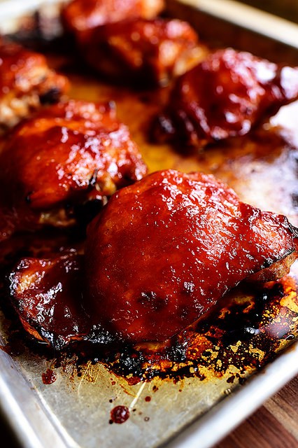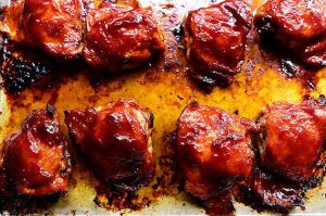 - hella sósunni yfir kjúllabitana og stinga í 200°C heitan ofn í c.a hálftíma.